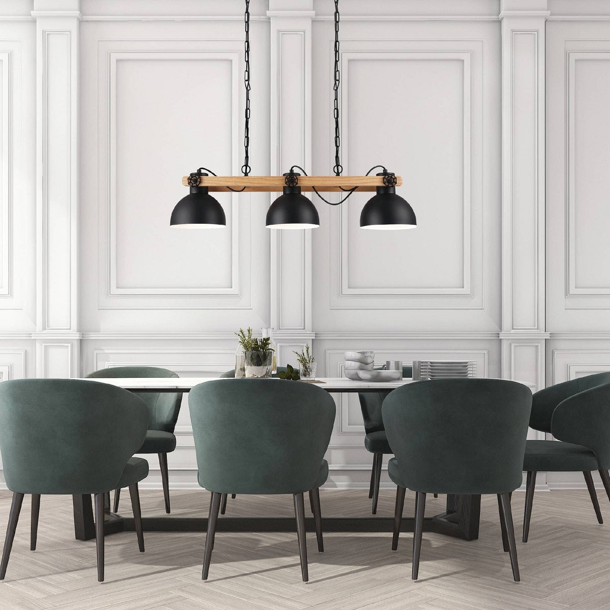 Bring a sophisticated industrial vibe to any living space with the Lubenham 3 Light Pendant. Featuring matt black steel shades complemented by solid timber highlights, it perfectly blends modernity with classic charm.