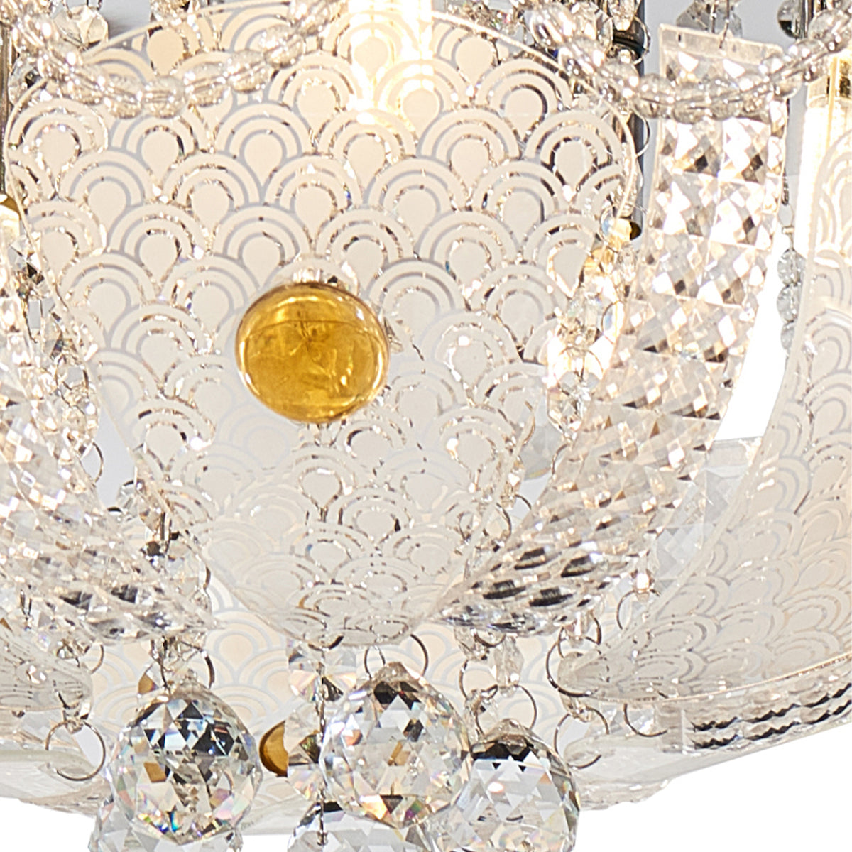 The fixture features frosted glass leaves with fine printed details alongside decorative amber jubes that provide gentle, warm lighting. Clear optic crystal components help distribute light evenly, complemented by a stainless steel ceiling plate to optimise overall brightness.