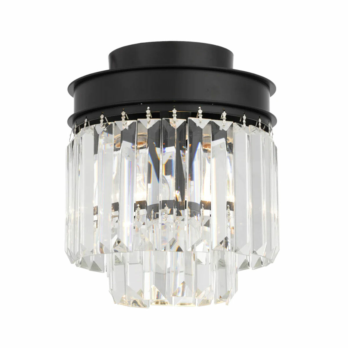 The Serene Batten Fix brings classic Art Deco style to any room with a timeless blackened bronze round frame and faceted crystal prisms that scatter light softly.