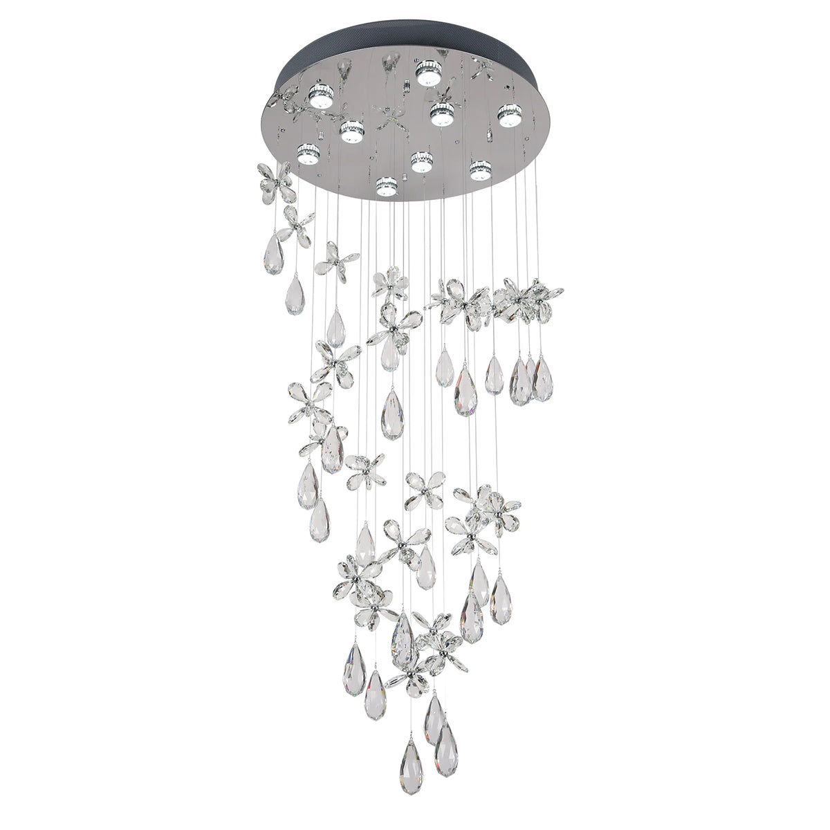 This fixture is pre-trimmed with crystal strands of fixed lengths and is securely attached to a precision-cut stainless steel ceiling plate. It provides a visually appealing combination of contemporary design and functionality, suitable for various home settings.