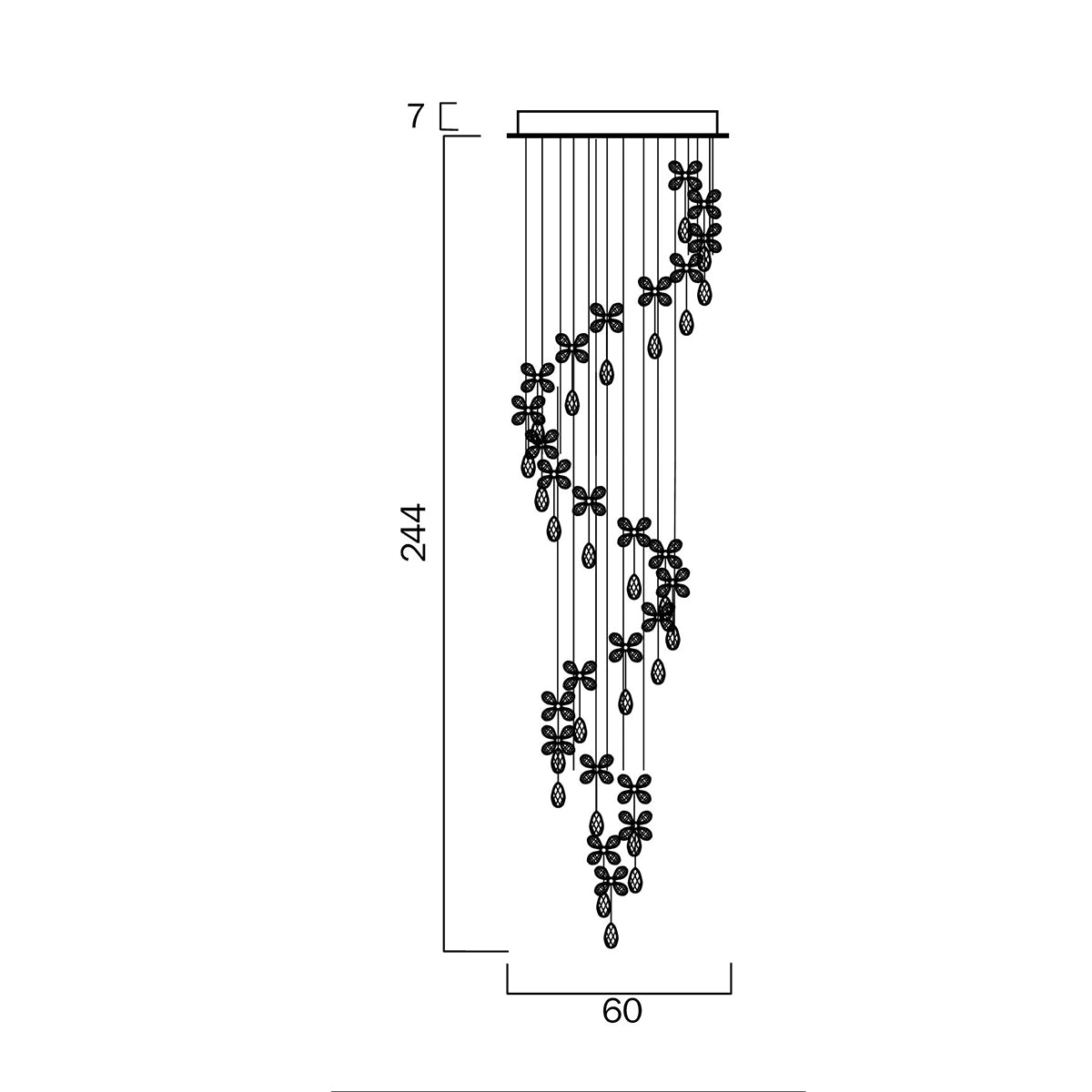 This fixture comes pre-trimmed with crystal strands of fixed lengths, securely mounted to a precisely designed stainless steel ceiling plate.